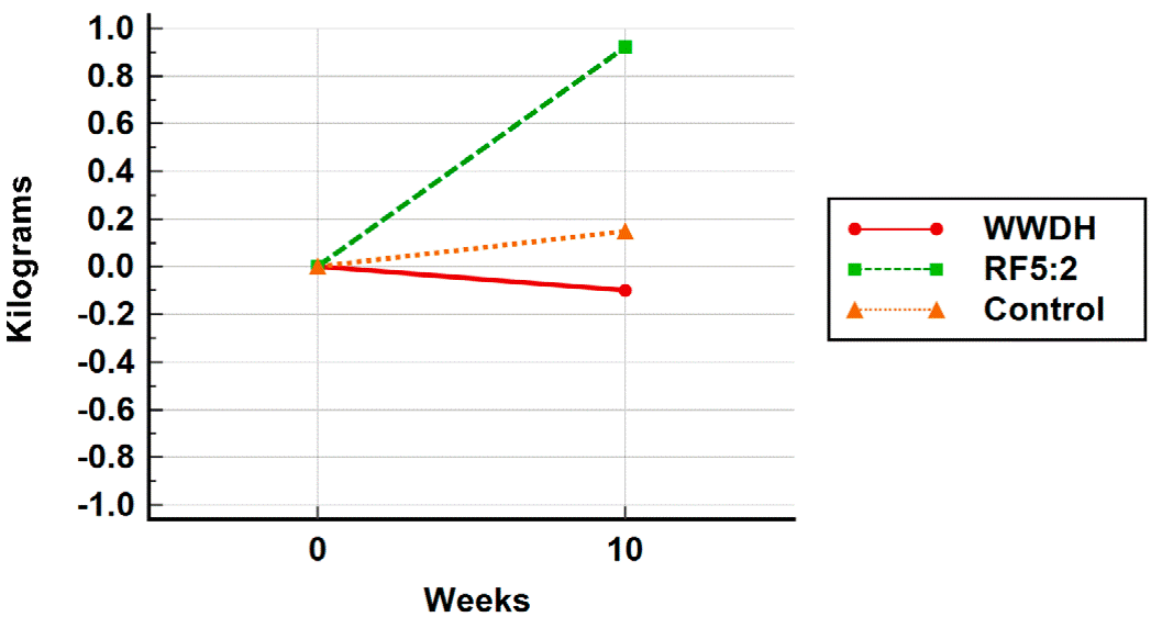 | Outcome | WWDH group (N= 10) | RF5:2 group (N= 11) | Control group (N= 11) | P value |