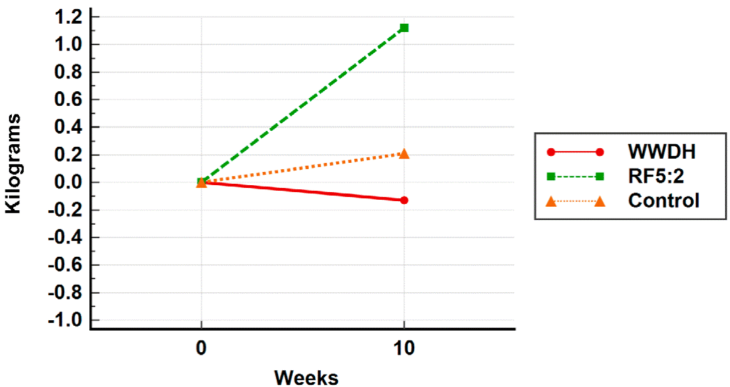 Participants were predominantly female (65.6 %), with a mean age ± standard deviation of 38.1 ± 11.3 years, and BMI of 30.4 ± 3.84 kg/m2. There were no significant differences between groups at baseline in any of the characteristics as was expected due to the randomization process (Table 1). Table 2 shows the results of the variables analyzed by the ITT approach. Results for weight change at 10 weeks showed no difference between groups (WWDH: -0.10 ± 1.81, 95 % CI -1.40 to 1.19; RF5:2: 0.92 ± 1.18, 95 % CI 0.12 to 1.71 and control group: 0.15 ± 1.68, 95 % CI from -0.98 to 1.28) (Figure 2), though a positive trend was observed for the WWDH group and a negative trend for the RF5:2 group, both compared to the control group. For secondary outcomes, no differences were observed between the groups.