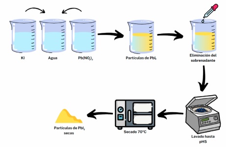 Se llevó a cabo la síntesis de nanopartículas de yoduro de plomo (PbI₂) mediante precipitación química. Para esto se preparó una solución acuosa con nitrato de plomo (Pb (NO₃)₂) y yoduro de potasio (KI) a partes iguales en un vaso de precipitados con 40 ml de agua desionizada. La mezcla se agitó constantemente a temperatura ambiente, permitiendo que la reacción ocurriera durante dos horas. Las nanopartículas formadas se separaron por centrifugación a 6000 rpm (3220 × g) durante 10 minutos, se utilizó una centrifuga HERMLE Benchmark Z 206 A, posteriormente, las nanopartículas pasaron por un proceso de secado en un horno TERLAB a 70 ºC, como se puede apreciar en la figura 1.