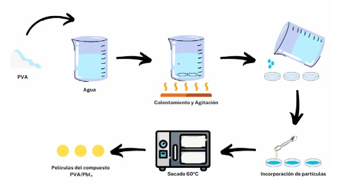 La matriz de polivinilalcohol (PVA) se sintetizó disolviendo 1.5 g de PVA en 50 mL de agua desionizada a 60 ºC, con agitación constante hasta la disolución completa. Posteriormente, se dejó enfriar la solución de PVA a temperatura ambiente para verterla en los moldes y pasar al proceso de secado a 70 ºC, en un horno de secado TERLAB, por 24 horas. Se prepararon películas de compuestos de PVA con diferentes concentraciones de PbI₂ (0.5 %, 1.0 %, 1.5 %, 2.0 %), como se puede apreciar en la figura 2. Este proceso es capaz de producir nanopartículas de alta pureza con una estructura cristalina hexagonal, típicamente con diámetros de entre 50 y 200 nm.