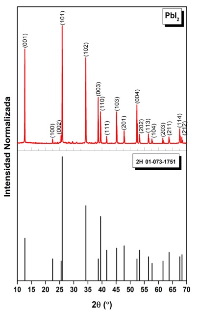 La caracterización estructural de las partículas de PbI₂, mostrada en la figura 3, revela que las partículas presentan un alto grado de cristalinidad, como se confirma por el difractograma obtenido (Ismail et al., 2016). Los patrones de difracción de rayos X se compararon con la carta cristalográfica del politipo hexagonal 2H del PbI₂, lo cual permitió identificar su estructura cristalina. Los picos característicos de este politipo fueron observados en los ángulos de difracción 2θ correspondientes a los planos principales (001), (101) y (102), coincidiendo con los datos de la base de datos JCPDS # 01-073-1751 (El-Mongy et al., 2020).
