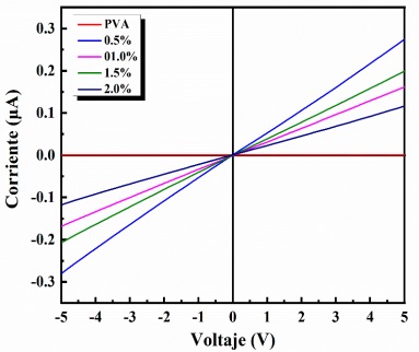 El comportamiento eléctrico de las películas, tanto de PVA como del compuesto de PVA/PbI2 con sus diferentes adiciones de partículas de yoduro de plomo se puede observar en la figura 8. La medición se realizó por medio del método de dos puntas. Donde se puede observar que la película de PVA no presenta alguna respuesta eléctrica obteniendo una resistencia de 4.318 × 107 Ω, sin embargo, al adicionar las partículas de PbI2 se propicia una diminución en la resistencia en el orden de ~106 Ω. Lo cual se refleja en incrementos en la corriente en respuesta a las diferentes adiciones de partículas de PbI2 (Sabry, Mohammed and Yahia, 2019). Además, los resultados muestran que se tiene una buena conexión óhmica debido al comportamiento lineal de las mediciones (El-Zahhar et al., 2022b). Con lo anterior, se puede inferir que debido a la modulación de corriente debida a la incorporación de las partículas en el PVA el material compuesto es prometedor para aplicaciones en electrónica flexible.
