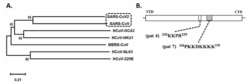 Phylogenetic reconstruction reveals a close relationship between the SARS-CoV-2 N protein and SARS-CoV N protein sequences in a 94 % of the analysis (Figure 1A.).