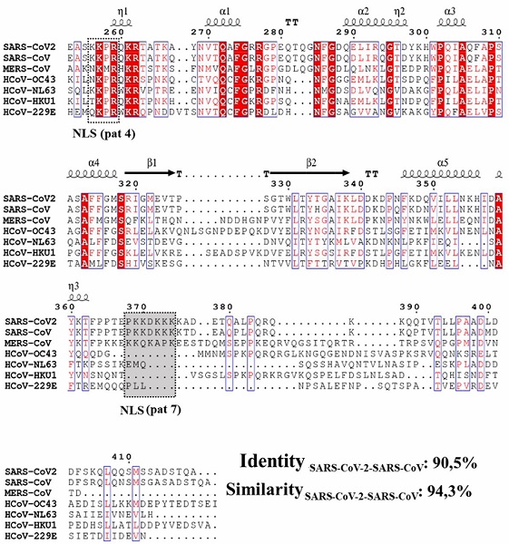 The NLS sequences detected in SARS-CoV-2 N protein are similar to those described in SARS-CoV N protein, however, in SARS-CoV a third NLS monopartite pat 7 sequence was recorded next to N-terminal domain between residues 38 to 44, which is absent in SARS-CoV-2 N protein due to substitution of residue 38 for a serine. The presence of NLS sequence next to the N-terminal domain of the SARS-CoV N-protein is functional, leading an exogenous protein into the nucleus, however it seems to be not relevant for the success of viral infection, becoming more important NLS sequences close to the C-terminal domain (Timani et al., 2005).