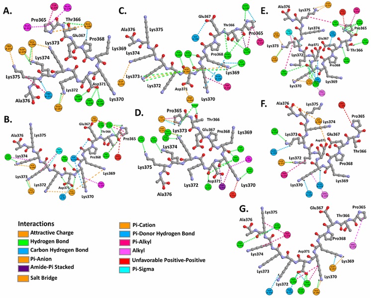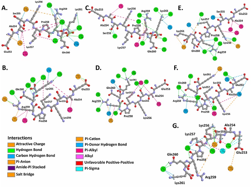 Residues Glu107, Trp142, Asn146, Ala176, Glu180, Trp184, Ala222, Tyr225, Trp231, Glu266, Asp270, Trp273 of importin α1, and residues Ser99, Glu101, Pro104, Trp136, Ser143, Arg217, Asp260, Trp263, Glu174, Trp178, Asn182, Trp221, Asn225 of importin α8, interact by hydrogen bonds, carbon hydrogen bonds, Pi interactions with hydrogen bonds donors, hydrophobic and electrostatic interactions with the NLS pat7 sequences (Figure 4A,B., Supplementary Figure S2, Supplementary Figure S3, Supplementary Table S1).