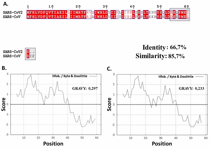 Figura 5. A. Alineación de las secuencias de las proteínas ORF6 de SARS-CoV y SARS-CoV-2, segmento de unión a importina α1 resaltado. B-C. Diagrama de hidrofobicidad e índice de ORF6 viral según Kyte & Doolittle (1982). B. Proteína ORF6 del SARS-CoV. C. Proteína ORF6 del SARS-CoV-2.