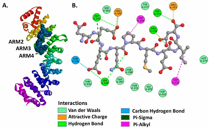 The active residues registered in importin α1 were Trp142, Arg101, Trp184, Arg238, Trp273, Arg315, Trp231, Ser149, Asn146 belonging to ARM2-ARM4 domains (Figure 6A.). The importin α1-ORF6 complex is stabilized with hydrogen bonds, carbon-hydrogen interactions, Pi orbitals and Sigma orbitals interactions, electrostatic attractions and hydrophobic interactions (Figure 6.B).