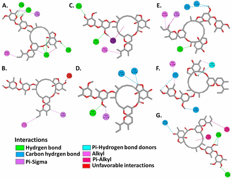 On the other hand, complexes formed with α3 subfamily isoforms revealed Trp191, Gly194, Asn195, Arg230, Trp234 as active residues in importin α5, Trp189, Asp271, Trp274 in importin α6, and Gly155, Arg228, Trp232, Asn236, Trp274 in importin α7. These residues interact with ivermectin by hydrogen bonds, interactions between polarized carbon atoms and hydrogen, alkyl chains interactions, Pi and Sigma orbitals interactions, Pi orbitals and alkyl chains interactions, and interactions between Pi orbitals and donors groups of hydrogen bond (Figure 7E,F,G,. Supplementary Table S2).