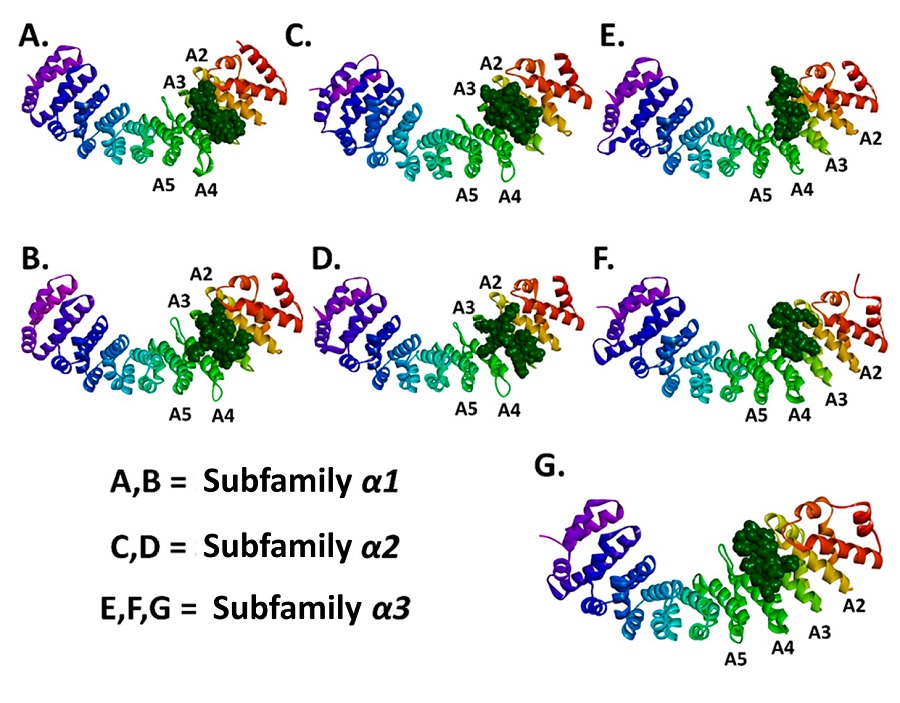 Human genome encodes seven importin α isoforms that are grouped into three subfamilies known as α1, α2 and α3, which share a common structure consisting in Importin β1 Binding domain (IBB) and ARM domains, that have the ability to interact with NLS sequences at major and minor binding sites, respectively (Pumroy and Cingolani, 2015).