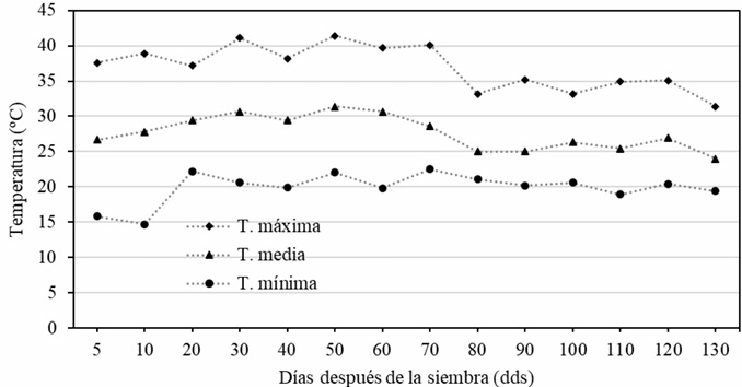 Es importante indicar que en la etapa vegetativa y primera semana de la floración e inicio de cuajado de frutos se registraron las temperaturas más altas (40 a 42 ºC); sin embargo, éstas descendieron en toda la etapa de madurez fisiológica-cosecha, al tener temperaturas máximas de 33 a 35 ºC, medias de 25 a 27 ºC y mínimas de 19 a 21 ºC (Figura 1). Al respecto, Seo-Young y Chan (2019) indican que las temperaturas diurnas óptimas para la floración de las plantas de chile son de 26 - 28 ºC; cuando se presenta una temperatura alta (> 30 °C) no solo reduce el número total de frutos por aborto floral, sino que también provoca la malformación de frutos, por este motivo resulta importante las aplicaciones de silicio con el objetivo de reducir el estrés de las plantas generado por las altas temperaturas.