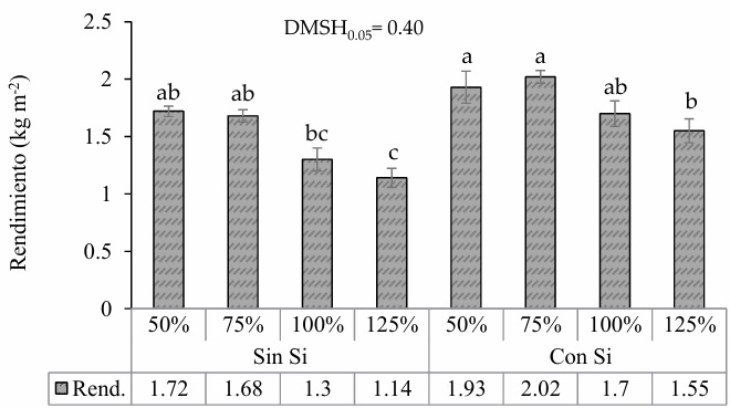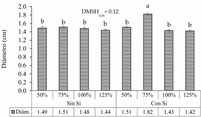 En la Tabla 1 se puede observar que las únicas variables que mostraron significancia (α ≤ 0.05) por efecto de la SN × Si fueron el rendimiento y el diámetro de frutos de primera calidad. En este sentido, las plantas fertilizadas con la solución al 75 % con Si presentaron el mayor rendimiento (2.02 kg m-2), el cual fue estadísticamente similar con las plantas con la aplicación Si y SN al 50 y 100 % (1.70 a 1.93 kg m-2) y sin Si con las SN al 50 y 75 % (1.68 a 1.72 kg m-2). La mayor diferencia en rendimiento se observó en plantas fertilizadas con Si y las soluciones al 50 y 75 %, que fueron superiores en 48.5, 55.4 y 69.3, 77.2 % a las plantas fertilizadas con las soluciones más concentradas (100 y 125 %) sin aplicación de Si, respectivamente (Figura 2). La respuesta negativa que tuvieron las soluciones de mayor concentración en el rendimiento puede deberse al efecto nocivo que genera la acumulación de sales en el sustrato. Mientras que, el efecto positivo de las soluciones de menor concentración se relaciona con el aumento del tamaño (diámetro) de los frutos que se obtuvo con estas mismas combinaciones. Por otro lado, las plantas fertilizadas con SN al 75 % con aplicación de Si produjeron los frutos de mayor diámetro (1.82 cm), que fueron estadísticamente superiores en 22.1, 20.5, 23.0, 26.4 % al tamaño de los frutos cosechados de las plantas fertilizadas únicamente con las soluciones de 50, 75, 100 y 125 % respectivamente, y superiores en 20.5, 27.3 y 28.2 % al diámetro obtenido con las soluciones al 50, 100 y 125 % con aplicación de silicio (Figura 3).