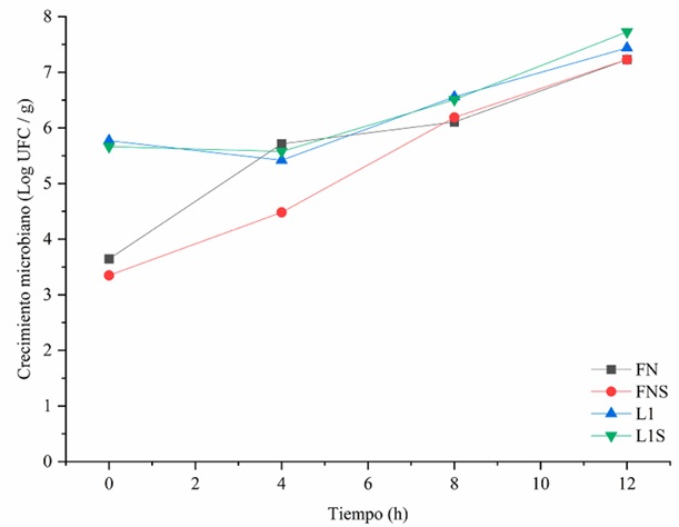 Durante la fermentación se mantuvo una temperatura entre 18º C y 20 º C y un pH inicial de 5.0, L1 y L1S presentaron los valores de pH más bajos de 4.5. En la CTV de levaduras, los tratamientos con L1 mostraron una mayor población (> de 3 log) en comparación con los de la fermentación natural, no se observaron diferencias significativas entre los tratamientos de fermentación sumergida o en seco (Figura 1). Aunque la temperatura óptima de fermentación para levaduras S. cerevisiae es de 25 a 30°C, recientes estudios han demostrado que las levaduras pueden desarrollarse en temperaturas inferiores a las óptimas (25 - 30 °C) debido a la presencia de genes responsables a la adaptación al frio que generan cambios morfológicos y fisiológicos que les permiten ser viables (Tiwari et al., 2015). Adicionalmente la adaptación a temperaturas que pueden ir de los 10 a 20 °C son idóneas para la formación de atributos sensoriales deseables en la fermentación de bebidas como cerveza y vino, debido a que promueven la formación de compuestos orgánicos volátiles deseables en el alimento (Liszkowska y Berlowska, 2021; Paget et al., 2014). La cepa L1 pertenece a la especie de S. cerevisiae, es una cepa de la marca LALCAFÉ CIMA™ comercializada por la empresa LALLEMAND utilizada como cultivo iniciador en la fermentación de café, sus características indican que es esta cepa permite un mejor control de la fermentación aumentando la calidad sensorial de la taza (Contreras-Delfín, 2019). Esta misma fue utilizada para la fermentación de la pulpa de café donde se observó que la cepa requirió un periodo de adaptación en las primeras 4 h de fermentación, posteriormente su crecimiento alcanzó valores de 7.73 Log UFC/g en L1S y 7.44 Log UFC para L1. La FN y FNS alcanzaron valores finales similares a L1 y L1S lo cual indica que son especies bien adaptadas al tipo de sustrato.