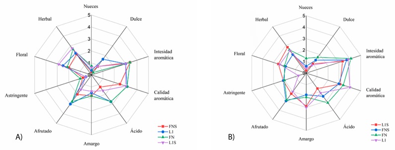 En la Figura No. 3 se presentan los resultados del análisis descriptivo de las infusiones preparadas con la pulpa seca proveniente de los diferentes tratamientos. Para la preparación de las bebidas se utilizó una extracción en caliente (prensa francesa) y una extracción en frio (cold brew). Las evaluaciones fueron realizadas por ocho jueces entrenados previamente en la identificación de aromas y detección de sabores. La Figura No. 3 muestra que las bebidas preparadas en caliente con pulpa de café proveniente de los cuatro tratamientos presentan el mismo perfil sensorial, las diferencias se observan en la intensidad de cada descriptor, las bebidas de L1 y L1S se caracterizan por presentar notas más intensas a floral y afrutado, los tratamientos con FN y FNS presentan menor acidez que los tratamientos L1 y L1S. Sin embargo, los tratamientos L1 y FN tienen notas afrutadas más pronunciadas. Los jueces también describieron otras notas como cítrico, jamaica y tamarindo para los tratamientos L1 y L1S. El perfil sensorial de las infusiones preparadas en frio fueron similares a las anteriores, los jueces detectaron notas a manzanilla, herbal, florales, jamaica y tamarindo. Estos resultados están correlacionados con los compuestos volátiles encontrados donde se identificaron aldehídos como linalool, geraniol, benzaldehído, (z)-3-hexenal y la ץ-undecalactona que son compuestos claves en la flor de jamaica y tamarindo (Camelo-Méndez et al., 2013), lo que concuerda con lo identificado por el panel sensorial. La prueba de diferenciación 2-AFC consistió en establecer diferencia significativa entre dos infusiones de pulpa de café, en este trabajo se compararon los tratamientos fermentados tanto naturales (FN, FNS) como fermentados (L1, L1S) contra una muestra de pulpa comercial sin fermentar. La nota astringente fue definida como la sensación de resabio, descrito como sequedad en la cavidad oral así como fruncimiento y encogimiento de la piel, que es propia de la presencia de ácidos en la bebida como ácidos clorogénicos y ácidos orgánicos (Yeager et al., 2021). Como resultado de este trabajo no se encontró diferencia significativa entre tratamientos en comparación con la bebida preparada a partir de pulpa comercial. La nota astringente fue percibida en todos los tratamientos y en los dos métodos de extracción.