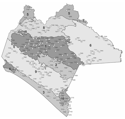 Figura 1 Ubicación de las 188 estaciones climáticas y clave correspondiente (CONAGUA, 2024) por subprovincia fisiográfica (INEGI, 2001) del estado de Chiapas: 1. Altos de Chiapas; 2. Depresión Central de Chiapas; 3. Llanura Costera de Chiapas y Guatemala; 4. Llanura del Istmo; 5. Llanuras y Pantanos Tabasqueños; 6. Sierra Lacandona; 7. Sierras Bajas del Petén; 8. Sierras del Norte de Chiapas; 9. Sierras del Sur de Chiapas; 10. Volcanes de Centroamérica.