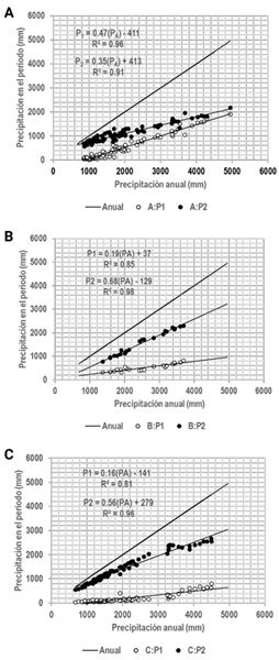 Figura 2 Relación entre la precipitación anual (PA) y la captada en dos periodos distintos: noviembre a abril (P1) y junio a septiembre (P2) en las subprovincias fisiográficas de Chiapas, México. A: Altos de Chiapas, Llanuras y Pantanos Tabasqueños, Sierras del Norte de Chiapas; B: Sierras Bajas del Petén y Sierra Lacandona; C: Depresión Central de Chiapas, Llanura Costera de Chiapas y Guatemala, Llanura del istmo, Sierras del Sur de Chiapas y Volcanes de Centroamérica.