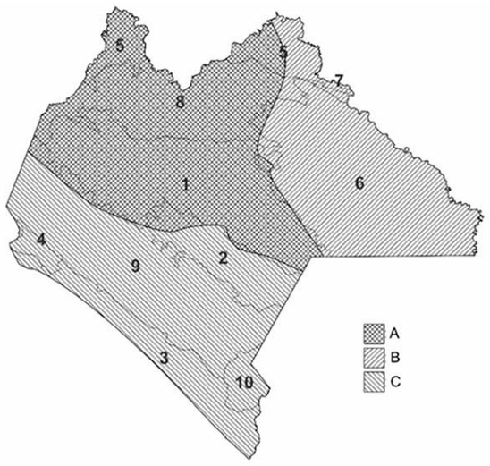 Figure 3: Rainfall zones in Chiapas, Mexico, according to the relationship between annual precipitation (PA), precipitation from November to April (P1), and precipitation from June to September (P2). PA: A= 855 to 4954 mm, B= 1374 to 3693 mm, C= 674 to 4498 mm; P1: A= 33 to 1902 mm, B= 313 to 822 mm, C= 33 to 809 mm; P2: A= 567 to 2170 mm, B= 774 to 2302 mm, C= 546 to 2665 mm. Numbers indicate the physiographic subprovince in Chiapas (INEGI, 2001): 1. Chiapas Highlands; 2. Central Depression of Chiapas; 3. Coastal Plain of Chiapas and Guatemala; 4. Isthmus Plain; 5. Tabasco Plains and Swamps; 6. Lacandon Jungle; 7. Low Mountains of the Petén; 8. Northern Chiapas Mountains; 9. Southern Chiapas Mountains; 10. Central American Volcanoes.