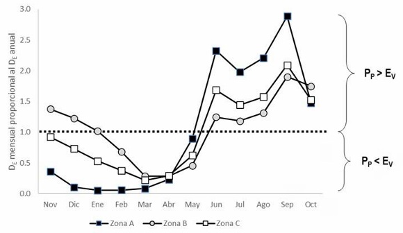 Es importante hacer notar que el análisis aquí presentado hace énfasis en la similitud de la distribución de la humedad en la región y no en los datos puntuales ni absolutos. De hecho, dentro de cada una de las zonas definidas hay variaciones notables en el DE tanto a nivel mensual como anual. Al respecto, si se hace el contraste entre el valor máximo y mínimo del DE por zona, la diferencia en la zona A es de siete, en la B es de seis y en la C de cuatro veces entre ambos extremos, lo que indica regiones con distinta condición de humedad. A pesar de ello, la tendencia de la distribución del DE a lo largo del año es similar dentro de cada zona y, desde luego, diferente entre ellas.