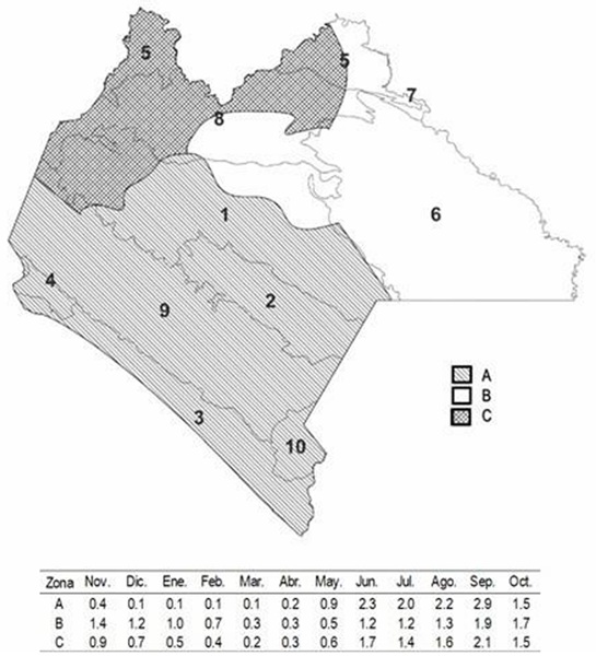 La tendencia entre ambas variables (DEP1 y M) hacen evidente las diferencias de humedad en la región en estudio y coincide geográficamente con la pluviosidad en Chiapas (Figura 3), aunque la evaluación de la lluvia y la incorporación del DE en el análisis sólo hace referencia a los volúmenes totales que se registran durante el estiaje, no esclarece lo que ocurre durante el periodo lluvioso ni tampoco para un mes específico. Por ello, se amplió el período de análisis en comento para conocer la distribución del DE durante todo el año para apreciar los contrastes que ocurren en la estación seca y la húmeda en el estado. El estiaje es más extremo en la Zona A que en el resto del estado, pero durante la época lluviosa se invierte totalmente dicha condición (Figura 4).