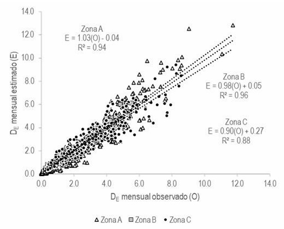Con el procedimiento propuesto es posible conocer el DE que ocurre en un mes en particular y sitio específico, para ello, se identifica la zona a la que corresponda la ubicación geográfica de interés, se selecciona el coeficiente del mes deseado (Figura 5) y se multiplica por su DE anual. La precisión de la evaluación del DE se hizo a través de la relación entre los valores estimados y los observados (Figura 6).
