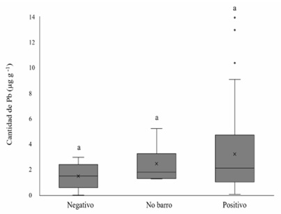 Este estudio se enfocó en determinar el contenido de Pb en alimentos preparados y servidos en UBPb; sin embargo, se detectaron niveles de Pb por encima de los valores de referencia en 5 alimentos preparados en utensilios de barro sin Pb y en 6 alimentos preparados en otro tipo de utensilios. Esto indica que la fuente de Pb en los alimentos es variada y no exclusiva del barro vidriado. Aunado a esto, y aunque la concentración promedio de Pb en alimentos preparados en UBPb (2.36 µg g-1) fue mayor al promedio determinado en alimentos preparados en utensilios negativos a Pb (1.8 µg g-1), no se encontraron diferencias significativas entre ambos grupos (p = 0.380). Asimismo, tampoco se determinaron diferencias significativas entre las concentraciones de Pb en alimentos preparados en barro y las concentraciones de Pb en alimentos preparados en otro tipo de utensilios diferentes a los de barro (p = 0.448) (Figura 2). Esta heterogeneidad en la distribución de Pb en los alimentos puede deberse a varias fuentes de Pb que han sido documentadas como la movilización de polvos que contaminan los alimentos o a la presencia de niveles altos de Pb en sedimentos y alimentos como los berros en algunas regiones del río Sonora (Del Rio et al., 2012; Romo et al., 2020).