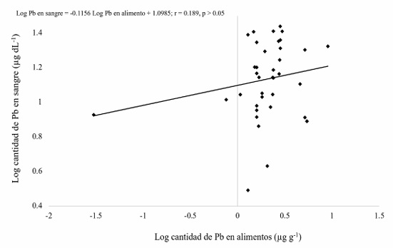 Los niveles de PbS de participantes expuestos por el uso de barro vidriado con y sin Pb no mostraron diferencias significativas (p = 0.11), lo que refuerza la afirmación de que el barro vidriado no es la fuente única del elemento. Como se mencionó anteriormente, los niveles de Pb en los alimentos estuvieron por encima de dos regulaciones internacionales, pero solamente presentaron una débil correlación positiva con los niveles de PbS (Figura 3; r = 0.19) la cual no fue significativa (p = 0.25). Por lo tanto, es imperativo un mayor muestreo para obtener una correlación significativa entre el Pb en alimentos y PbS, como lo reportado en otro estudio donde se observó un cambio moderado del 3 % en la cantidad de PbS en 353 niños por el consumo de dulces contaminados con Pb (Tamayo y Ortiz et al., 2016).