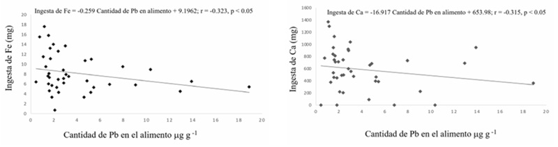 Aunque la ingesta de Fe y Ca entre quienes usan utensilios de barro vidriado negativos al Pb y los que usan UBPb no fue diferente significativamente (p > 0.05), se determinaron correlaciones negativas significativas entre la cantidad de Pb en alimentos y la ingesta de Fe (r = - 0.32; p < 0.05), y también con la ingesta de Ca (r = -0.31, p < 0.05) (Figura 4). Esto también soporta que el riesgo de intoxicación con Pb puede aumentar por la baja ingesta de estos nutrientes, que tiene un factor de protección contra la absorción del Pb desde los alimentos (Ahamed et al., 2007). Asimismo, se determinaron correlaciones negativas no significativas (p > 0.05) entre la concentración de PbS y la ingesta de Fe y Ca (r = - 0.11 y r = - 0.30 respectivamente). Sin embargo, es necesario un estudio más profundo que permita elucidar el posible efecto protector del consumo de estos nutrientes en la prevención de la intoxicación con Pb.