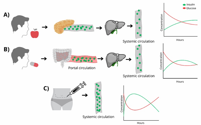 Oral insulin research holds great promise in biomedicine, as it aims to provide a non-invasive administration method that mimics the physiological secretion of the pancreas. Unlike the SC route, where insulin is absorbed into the systemic circulation, oral insulin is directed to the liver through the portal vein, thus replicating natural release patterns (Nabi-Afjadi et al., 2024) (Figure 1). This approach could optimize hepatic insulinization, reduce peripheral hyperinsulinemia, and minimize the risk of complications such as hypoglycemia, neuropathy, retinopathy, immunogenicity, and weight gain (Wong et al., 2016). Oral insulin would eliminate the need for injections, a frequent concern among patients due to fear of needles (Spain et al., 2016). Injectable insulin can also cause adverse reactions such as lipohypertrophy, hypersensitivity, infections, and pain (Demir et al., 2022). Other significant limitations of injectable therapy include affordability and the complexity of self-administration in older adults, both of which impact treatment adherence (Daniell et al., 2023).