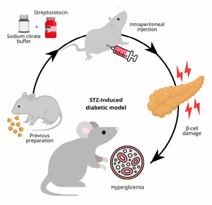 Experimental models classify according to the type of diabetes they represent (type 1 or type 2) and the method by which the disease develops (spontaneous, induced, or genetically manipulated) (López-Soto et al., 2024). Chemical induction models are the most used for studying the antidiabetic activity of new drugs and insulin formulations (Janapati and Junapudi, 2024). The induction protocols vary in dosage, age, sex, and weight of the specimens, as well as the route and timing of administration (Pandey et al., 2023). The most common chemical induction agents are streptozotocin (STZ) and alloxan, which progressively destroy pancreatic β-cells, resulting in insulin deficiency and sustained hyperglycemia (Athmuri and Shiekh, 2023) (Figure 2). Depending on the aims, high-fat diets sometimes accompany this process (Furman, 2021).