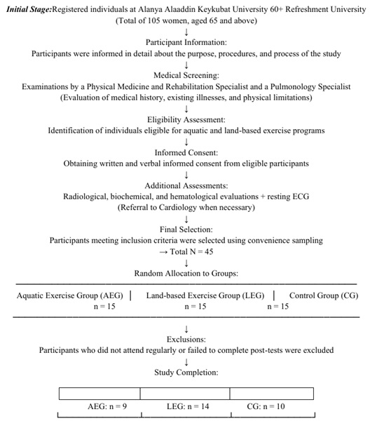 The study recruited 105 women aged 65 and older from a project at Alanya Alaaddin Keykubat University. All potential participants received detailed information about the study. Initial comprehensive medical evaluations, including history, physical assessment, and specialist consultations, determined eligibility for aquatic or land-based exercise programs. Additional tests (radiological, biochemical, hematological, ECG) and cardiology consultations were conducted as needed.