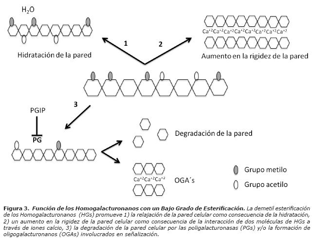 Cuando las pectinas son demetil esterificadas pueden ocurrir diversos procesos que incluyen la relajación o el aumento en la rigidez de la pared, la alteración en la adhesión celular y la generación de fragmentos de oligogalacturónidos (OGAs) (Fig.3). Los residuos con carga negativa del ácido galacturónico pueden interactuar con diferentes moléculas. Por un lado, se favorece la hidratación de la pared y, en consecuencia, se incrementa su relajación y por otro lado la interacción de un mínimo de nueve residuos de ácido galacturónico con calcio (Ca+2) promueve la formación de las estructuras denominadas "egg-box" que causan un aumento en la rigidez de la pared al establecerse una interacción entre dos moléculas de HG adyacentes. La formación de OGAs activos, con posibles funciones en señalización, es dependiente de los distintos patrones de esterificación del HG y de la actividad de las PGs (4,5).