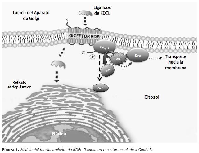 Está reportado que el receptor KDEL (KDEL-R) participa en la regulación del tráfico a través del aparato de Golgi. En el modelo planteado por Pulvirenti, se propone que el aparato de Golgi actúa como sensor del tráfico proveniente del retículo endoplásmico (1). La señal primaria relacionada con el tráfico está dada por el arribo de chaperonas al aparato de Golgi. Estas proteínas se unen al receptor mediante el motivo conformado por los aminoácidos KDEL. Esta unión activa a cinasas de la familia de Src, lo cual provoca una cascada de fosforilación. Consecuentemente, el transporte interno se activa y las proteínas chaperonas son transportadas de regreso al retículo endoplásmico.
