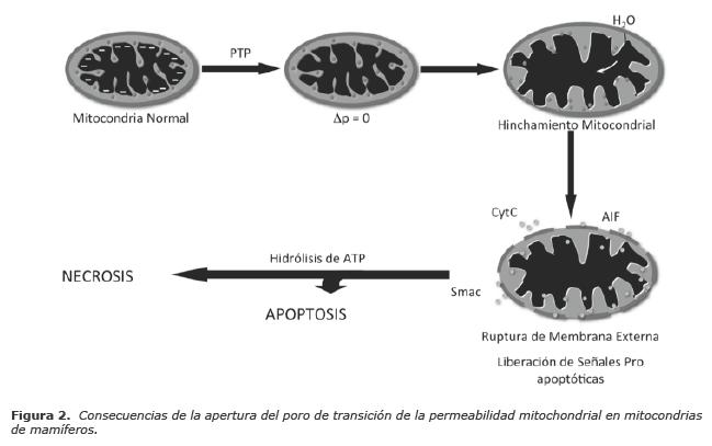 La consecuencia inmediata de la apertura del PTP es la depolarización del organelo (7). Como se mencionó anteriormente, el hinchamiento de la mitocondria ocasiona la incapacidad de estos organelos para recuperar su función productora de energía. En estas condiciones, la célula muere por necrosis (Fig. 2) (8). La liberación de factores apoptóticos así como de ligandos del receptor al factor de necrosis tumoral al espacio extracelular, inducen la apoptosis extrínseca en las células del tejido aledaño a la zona de isquemia (3). Durante un período de isquemia, el pH del medio intra- y extracelular tiende a descender. En estas condiciones, el PTP se encuentra inhibido (6,7). Actualmente se piensa que la protonación de ciertas histidinas en los componentes del poro, inhiben la apertura del canal en estas circunstancias. Sin embargo, cuando se reanuda el aporte sanguíneo al tejido/órgano, la cadena respiratoria comienza a operar restableciendo un gradiente en la concentración de protones e incrementando el pH celular a niveles cercanos a 7.4. En estas condiciones (elevados niveles de Ca2+ mitocondrial, daño por EROs y valores de pH suprafisiológicos) el PTP inicia el colapso final de la célula (4-8).