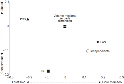 El análisis recuperó dos dimensiones latentes de la competencia con el mismo contenido temático según se encontró en Moreno (2003). El primero y más importante incluye temas de política económica y divide a los votantes que prefieren un papel más grande del Estado en la dirección del desarrollo económico, de los votantes que prefieren un desarrollo impulsado por el mercado. La segunda dimensión tiene que ver con temas sobre valores morales y separa a los votantes pro vida de los que defienden el aborto y de los que están a favor de la pena de muerte. La Figura 2 muestra la posición de la mediana que se identifica con cada partido y la del votante mediano independiente. También muestra al votante mediano en cada dimensión. Pero cuidado: no es necesariamente el mediano en ambas dimensiones (o sea, el mediano multidimensional). Es evidente que ninguno de los partidos, medido por la posición de los votantes que se identificaban con ellos, se acerca a la mediana en cada una de las dimensiones.