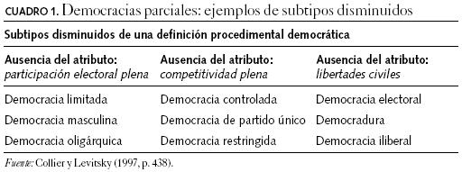 La concepción actualizada de lo que es una democracia incorpora básicamente tres requisitos procedimentales:1 competencia partidaria, participación electoral y libertades civiles. La carencia de algunas de estas características implica, para algunos autores, la descalificación de un régimen como democrático y en consecuencia ser clasificado como autoritario; mientras que para otros significa que es una democracia "disminuida" (Collier y Levitsky, 1997). Estos casos intermedios son denominados por Gasiorowski (1996, p. 471) como "semidemocracias".