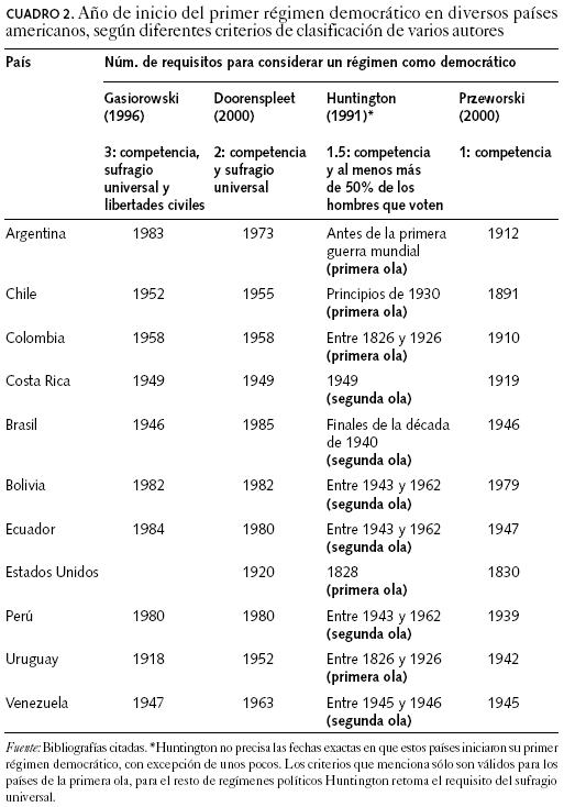 Una de las características más notorias en el cuadro 2 es la incongruencia en cuanto al año en que estos países empiezan a ser democráticos según los autores citados; estas diferencias pueden explicarse por los diversos criterios mínimos que se consideran como requisitos para una democracia. Así, la tendencia general que reproduce este cuadro es que "a menos criterios mínimos" de un autor, "mayor es la antigüedad" en que califica a un régimen como democrático.