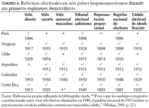 Como se aprecia en el cuadro 4, algunas de las reformas electorales fueron aprobadas antes del inicio del régimen democrático, como una forma de distender el ambiente político, satisfacer algunas de las demandas de la oposición, hacer que renunciara a sus estrategias subversivas y se incorporara al régimen vigente. Los casos más típicos de inclusión parcial de la oposición por parte del gobierno son Costa Rica, Chile y especialmente Uruguay, donde los colorados anticiparon casi todas las modificaciones electorales con el fin de involucrar a los actores políticos en un marco de reformas de mayor trascendencia, que incluso redefinió la estructura misma del Estado a partir de la nueva constitución de 1918.