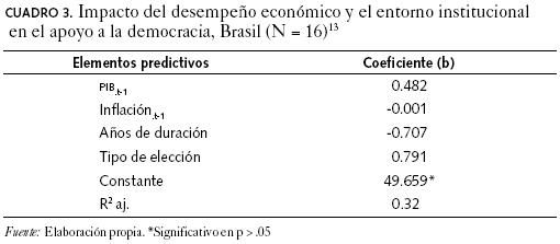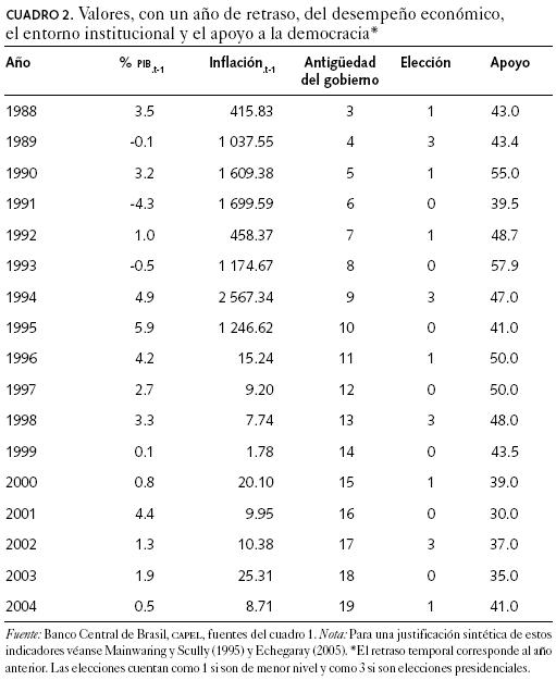 La serie de tiempo de la que se disponen datos de encuesta en Brasil nos permite llevar a cabo una prueba para validar las explicaciones en el nivel agregado acerca de la legitimidad de la democracia. Para los mismos años (con uno de retraso, para permitir que se apliquen los efectos), contamos con datos de indicadores clave del desempeño económico (por ejemplo, el crecimiento del PIB y la tasa de inflación), estímulos institucionales (por ejemplo, si el año coincidió con una elección de mayor o menor importancia, o si no hubo ninguna) y oportunidades de socialización (es decir, los años de antigüedad del gobierno democrático).10 En el cuadro 2 se resumen estos datos.