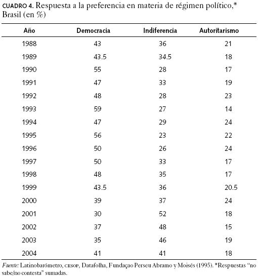 La mayoría de los brasileños que no se sentían inspirados por la democracia optaban por mantenerse indiferentes. Algunos especialistas interpretaron esto, de inmediato, como indicación de apatía política; otros, como expresión de cinismo político. Cualquiera que sea la interpretación, en su mayoría hacían coincidir esas elevadas tasas de indiferencia con una añeja visión de los brasileños como personas despolitizadas, poco dispuestas a dedicarle demasiado interés a las cuestiones políticas (Hollanda, 1986). Pero podría ocurrir que quienes se inclinaron por la "opción de la indiferencia", ante la pregunta encontrasen una alternativa más genuina para canalizar tanto sus sentimientos políticos respecto al régimen civil como su convicción democrática; por lo menos algunos brasileños sabían cómo había evolucionado la democracia en su país y tenían expectativas (o conocimiento) sobre cómo debería ser la misma. Según afirman Seligson y Carrión (2002), un gobierno de origen genuinamente democrático (es decir, que llega al poder a través de elecciones libres, abiertas, competitivas y equitativas), pero una vez en el poder se caracteriza por prácticas antidemocráticas, podría llevar a que los ciudadanos más sofisticados y profundamente democráticos se inclinaran por la opción de "es igual que el gobierno sea democrático o no democrático", como lo expresa la redacción de la pregunta. (Cuadro 4)