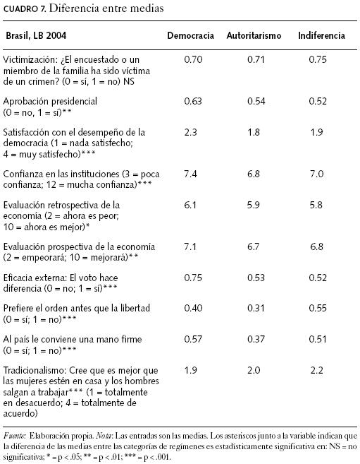 Una mirada inicial a los datos nos muestra que algunas de nuestras expectativas se cumplen y otras no (al menos en esta etapa preliminar; véase el cuadro 7). En términos del papel de los motivos utilitarios en las preferencias por tipo de régimen (lo que aquí denominamos racionalidad utilitaria), observamos que, como se esperaba, una mayor satisfacción con la forma en que funciona el gobierno democrático en el país se traduce en más apoyo a la democracia. Asimismo, la mayor confianza en las instituciones políticas claves está asociada también con más apoyo a este régimen. Por otro lado, las preferencias por tipo de régimen parecen estar vinculadas con la evaluación que el entrevistado hace sobre la eficacia de la democracia (el voto hace diferencia o no). En Brasil la gente que piensa "votar no cambia las cosas" tiene más probabilidades de inclinarse por el autoritarismo o de ser indiferente que quienes le asignan al voto una mayor eficacia. La percepción de una elevada eficacia parece ser una base utilitaria de apoyo a la democracia entre los brasileños.