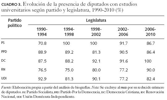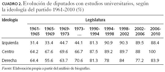 Uno de los principales cambios de la composición social de la élite parlamentaria observados en las últimas décadas en Chile se refiere al aumento significativo del nivel educacional de sus miembros. Los diputados elegidos desde 1989 presentan un nivel educativo considerablemente superior al que tuvieron sus colegas previos al golpe militar de 1973. En efecto, desaparecen los diputados con educación básica y secundaria incompleta y aumentan en forma considerable los que tienen estudios universitarios y de posgrado. En 1961 56.4 por ciento de los diputados tenía estudios universitarios (incluye porcentaje de posgrado), porcentaje que apenas se inclinó a 58.6 por ciento en la última legislatura antes de la clausura del Congreso Nacional en 1973. Por el contrario, dicha proporción se elevó hasta 83.4 por ciento en 1990 con la vuelta a la democracia y se ha mantenido con escasas variaciones en las legislaturas siguientes (cuadro 1).5