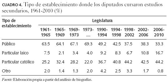 Además del nivel educativo, otro indicador relevante de la estructura educacional de la élite parlamentaria lo constituye el tipo de instituciones en las que cursaron sus estudios secundarios y superiores.6 En cuanto al tipo de colegios, observamos que la mayor parte de los diputados del periodo previo a 1973 (alrededor de 60 por ciento) estudió en establecimientos públicos, lo que era más frecuente entre los diputados de partidos de izquierda. Desde el retorno a la democracia en 1990 se observa un importante desplazamiento de la educación escolar pública como núcleo socializador de la élite parlamentaria, siendo una élite cuya experiencia escolar se privatiza. En comparación con la antigua democracia, los diputados incorporados a la Cámara baja en las legislaturas de los años noventa y posteriores tienden a provenir con una frecuencia bastante mayor que en el pasado de establecimientos privados, en particular de colegios católicos (cuadro 4). Éste es un rasgo que había sido patrimonio de los partidos de derecha, pero que en la última elección considerada en este estudio (2005) muestra que ha devenido también una importante característica en partidos como el PS y el PPD.