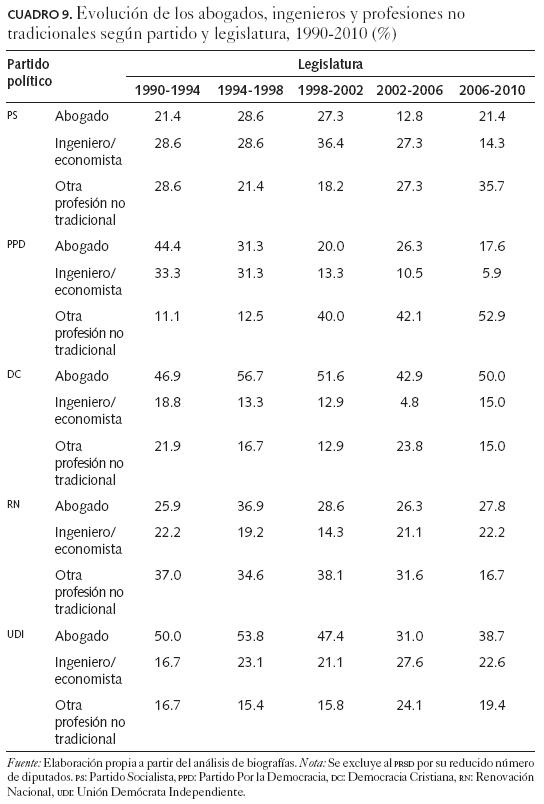 En las tres primeras legislaturas de la nueva democracia la proporción de abogados volvió a ser bastante alta, cerca de 40 por ciento, pero luego descendió bruscamente alcanzando 29.1 por ciento en 2002, permitiendo una mayor diversificación profesional de los integrantes de la cámara baja, aunque todavía con una alta prevalencia en la DC. No obstante esta creciente diferenciación profesional, facilitada por la disminución de los abogados y la incorporación de profesiones históricamente lejanas al ejercicio de la política (como arquitecto, sociólogo, actor, entre otras; profesiones más frecuentes en los partidos de izquierda, PPD y PS), más de la mitad del nuevo parlamento se concentra todavía en tres profesiones: abogado, médico e ingeniero comercial (economía y administración; con mayor presencia entre los partidos de derecha, especialmente la udi). En la última legislatura considerada en este estudio, 20062010, la composición profesional muestra que 32.4 por ciento son abogados, 13 por ciento son médicos y 11.1 por ciento son ingenieros comerciales. En porcentajes menores se sitúan los profesores (8.3%) y otros ingenieros (5.6%).
