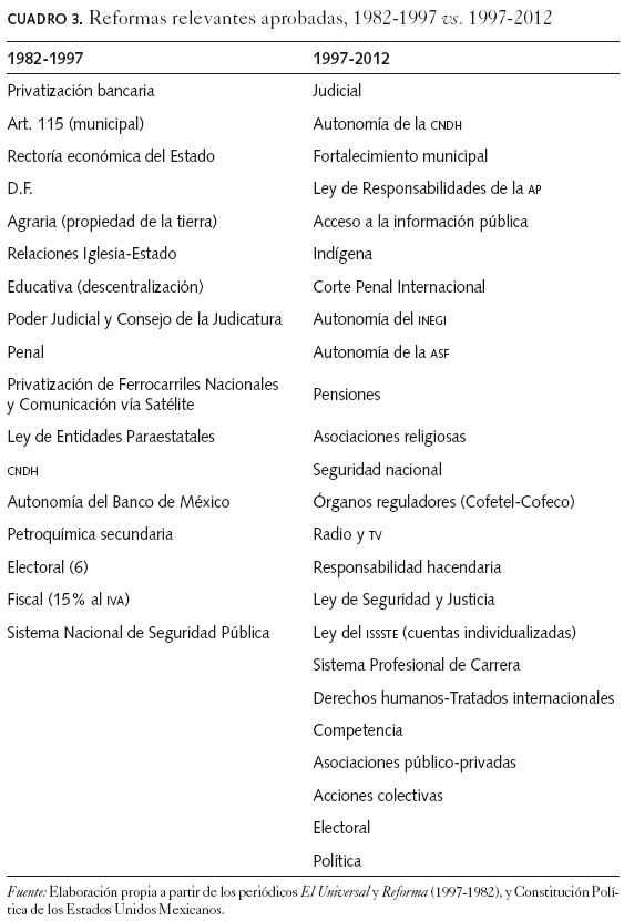 32 Es de resaltar que en la nueva legislatura (2012-2015), que empezó en septiembre de 2012, y que tampoco cuenta con un partido mayoritario en el Congreso, se han aprobado algunas de las reformas estructurales que no habían podido procesarse en legislaturas anteriores: la reforma a la Ley del Trabajo, la educativa, la de amparo y la de telecomunicaciones.