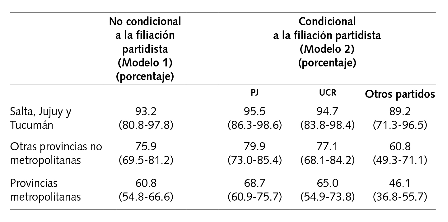 Si existe la cooperación intertemporal entre legisladores de provincias pequeñas, entonces se esperaría, independientemente de su filiación partidista, que los diputados de otras provincias no metropolitanas hubieran sido más proclives a apoyar la Ley del Azúcar que los diputados de las provincias metropolitanas. El cuadro 1a presenta los resultados de dos modelos logit simples de los votos para anular los vetos de Menem y de Duhalde.9 Los resultados indican claramente que los legisladores no metropolitanos fueron más proclives a apoyar la anulación que sus contrapartes metropolitanas. El cuadro 1b presenta las probabilidades estimadas de votar por la anulación por región y partido. Los diputados de provincias no metropolitanas, fuera de Jujuy, Salta y Tucumán, fueron, en promedio, 15.1 por ciento más proclives que sus contrapartes metropolitanas a apoyar las anulaciones. Estos resultados también se sostienen cuando se toma en cuenta la filiación partidista. Los legisladores del Partido Justicialista (PJ), de la Unión Cívica Radical (UCR) y de otros partidos de otras provincias no metropolitanas fueron, en promedio, 11.2, 12.1 y 14.7 por ciento respectivamente más proclives a votar en favor de las anulaciones que sus contrapartes metropolitanas. Por supuesto que dos modelos de regresión simple no pueden captar completamente los procesos causales detrás de los patrones de votación de los legisladores, pero los resultados encajan claramente con la expectativa de apoyo entre legisladores no metropolitanos.