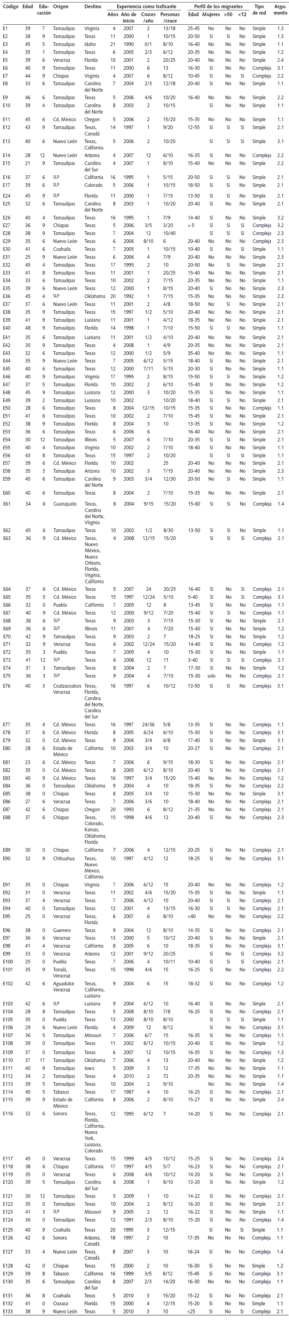 Un total de 133 traficantes de migrantes2 fueron entrevistados entre los años 2011 y 2015 en diferentes municipios de Tamaulipas, Nuevo León, San Luis Potosí, Veracruz, la Ciudad de México, el Estado de México y Chiapas. Las edades de los entrevistados estaban comprendidas entre 21 y 48 años, siendo la edad media de los mismos de 36.7 años. Los entrevistados comenzaron a trabajar en este negocio entre los 16 y los 41 años de edad, y tenían una dilatada experiencia en el mismo ya que el número de años que éstos se habían dedicado a esta actividad estaba comprendido entre cuatro y 21 años, siendo la media de 9.6 años (cuadro 1).