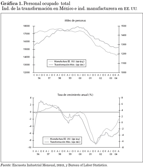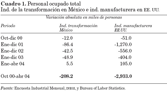 Como se aprecia en el cuadro 1, en México y Estados Unidos se observa una caída del empleo manufacturero desde finales del año 2000. En efecto, en el periodo octubre 2000-abril 2004, la industria de la transformación en México perdió más de 200 mil puestos de trabajo, mientras que su contraparte en Estados Unidos despidió cerca de 3 millones de trabajadores.