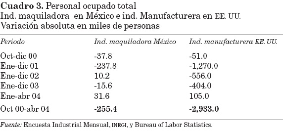 De acuerdo con los datos que se reportan en el cuadro 3, a nivel agregado, la industria maquiladora perdió más de 255 mil empleos entre octubre de 2000 y abril de 2004; esto es, 50 mil más que la industria de la transformación en el mismo periodo.