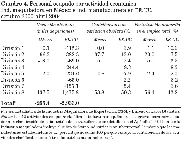 La mitad de los empleos manufactureros perdidos en cada país se concentró en la misma división: productos metálicos, maquinaria y equipo (división 8). Asimismo, coincide que en ambos países la segunda actividad más expulsora de trabajadores es textiles, prendas de vestir e industria del cuero (división 2). En el caso de México, ambas divisiones explican casi 3/4 partes de la caída total del empleo, mientras que en los Estados Unidos contribuyeron con 63% de la pérdida total de puestos entre octubre de 2000 y abril de 2004.