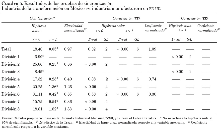 En el cuadro 6 resumimos los resultados anteriores para la industria de la transformación en México y la manufacturera de Estados Unidos.