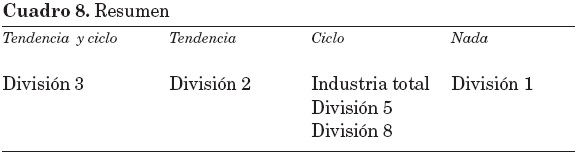 De esta manera el empleo en la división 8 en ambos países exhibe únicamente una tendencia común, no así ciclo compartido. Cabe destacar que si bien el empleo total en la industria de la transformación exhibe tanto tendencia como ciclo comunes, mientras que la división 8 (la más importante de la industria manufacturera) únicamente presenta evidencia de sincronización de largo plazo pero no en la frecuencia cíclica, es reflejo de que cada agregado posee su propio pgd; así, el hecho de que una división presente cierto comportamiento de correlación serial no implica que al sumar esos comportamientos (de distintas divisiones) se pueda obtener una representación con un patrón de correlación serial idéntico, sino que al combinar el correspondiente a todas las categorías agregadas se obtiene que en efecto posee el patrón de autocorrelación, pero no necesariamente es el mismo que la división con mayor peso.